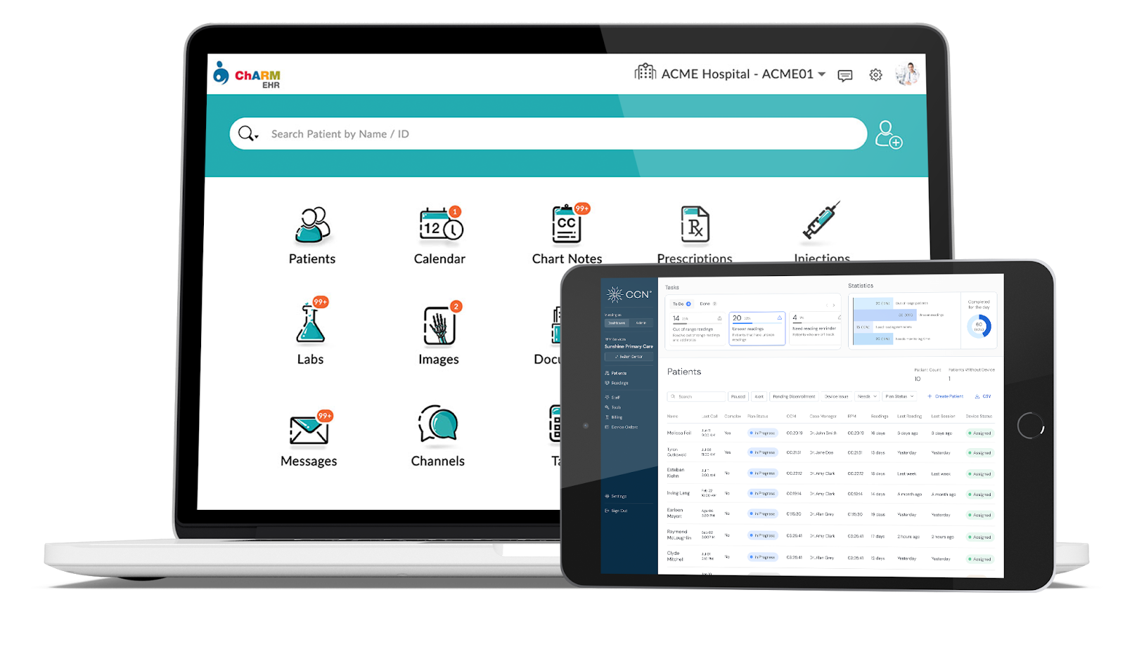 CCN Health is an approved technology partner with Charm Health. All blood pressure and heart rate measurements are automatically documented in Charm Health patient charts. Monthly PDF summaries are pushed as clinical documents and stored in patient charts.